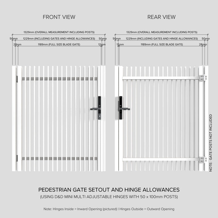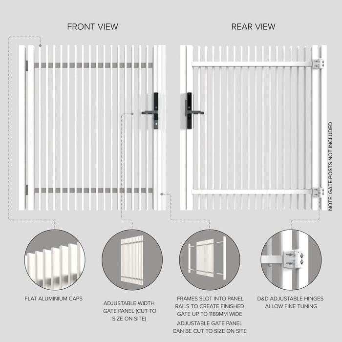 - We supply a Gate Panel to make a gate up to 1189mm wide (excluding posts). Panel can be cut to size on site. Review hinge and latch setout