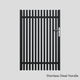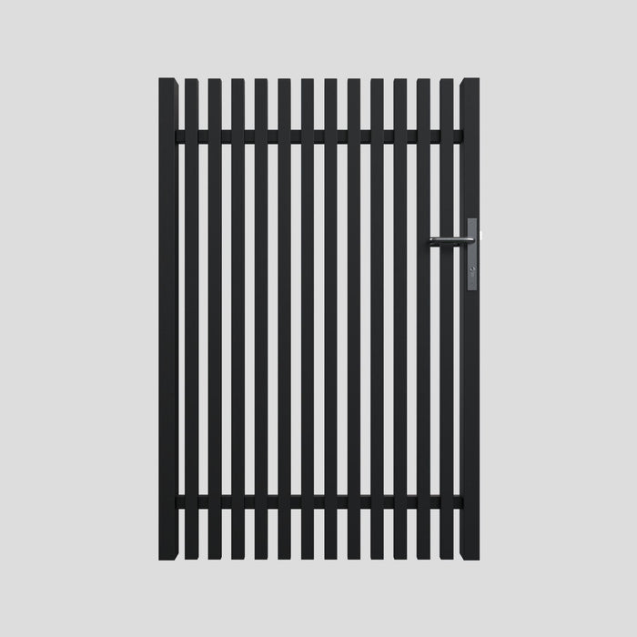 A modern architectural gate with vertical 40 x 40mm battens to match our aluminium batten fence panels. This gate frame is pre-drilled on the right side for easy handle and mortice lock assembly.