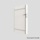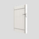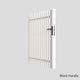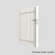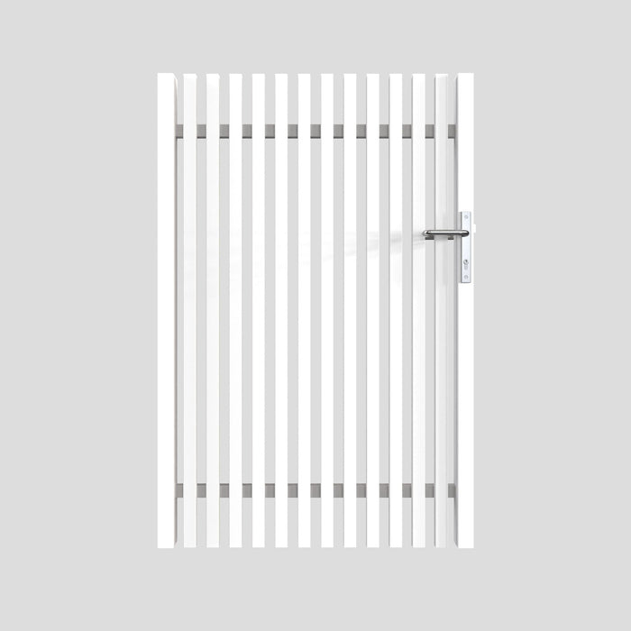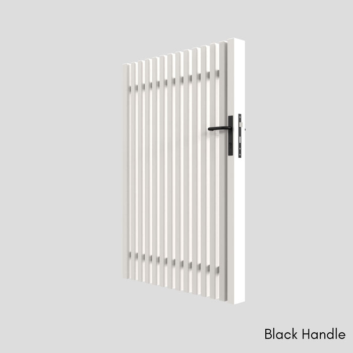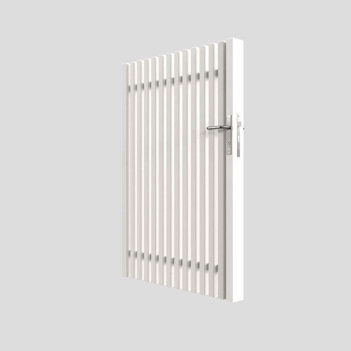 A modern architectural gate with vertical 40 x 40mm battens to match our aluminium batten fence panels. This gate frame is pre-drilled on the right side for easy handle and mortice lock assembly.