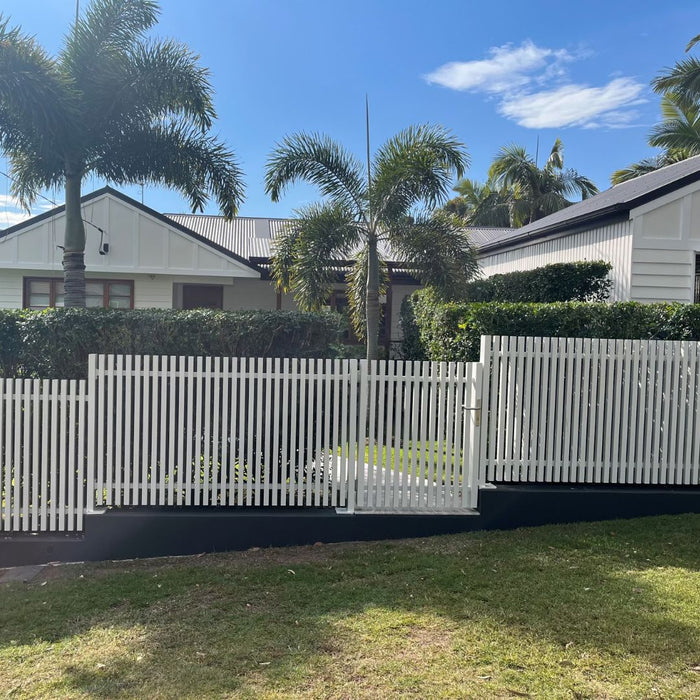 A modern architectural gate with vertical 40 x 40mm battens to match our aluminium batten fence panels. This gate is compatible with a lockable latch system.