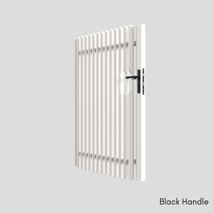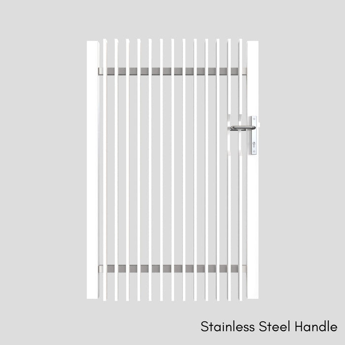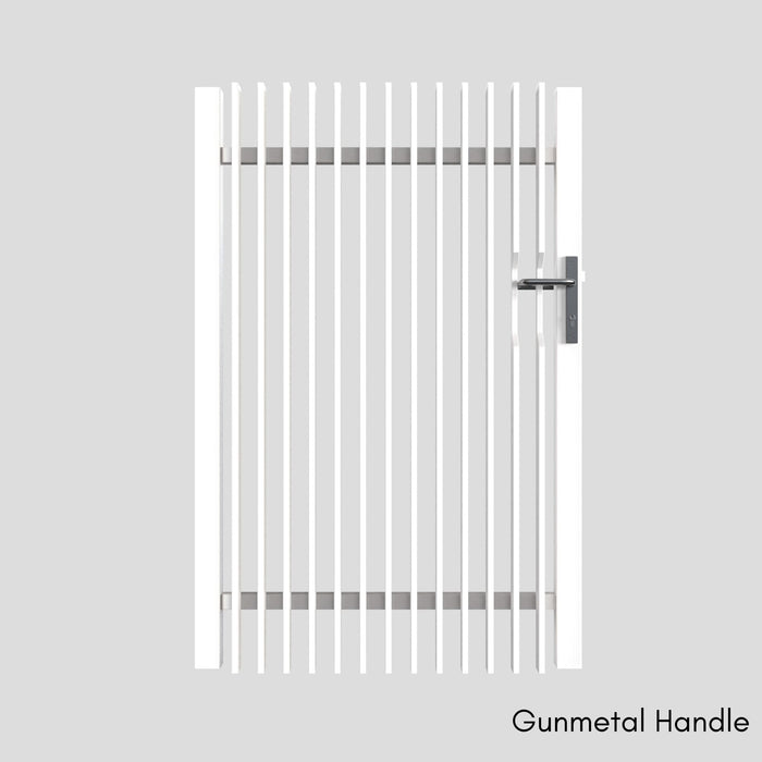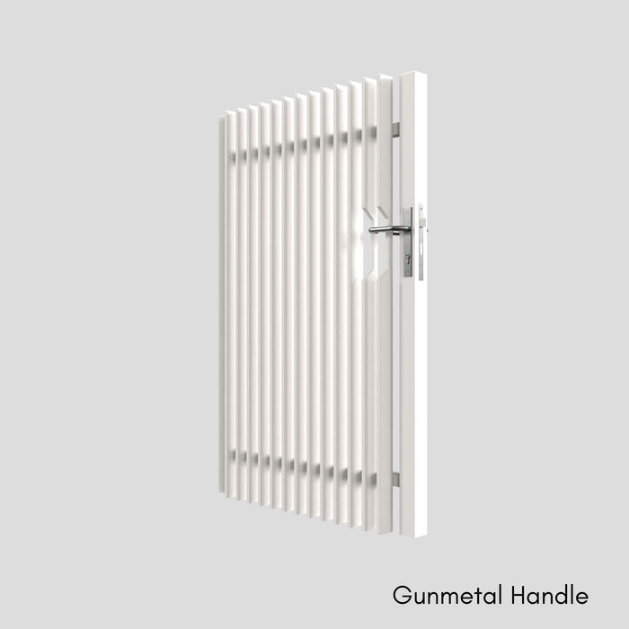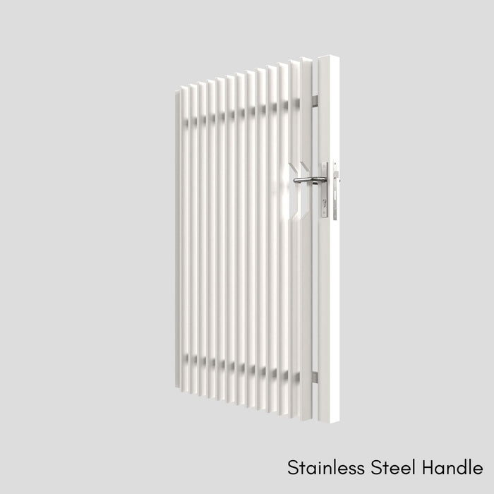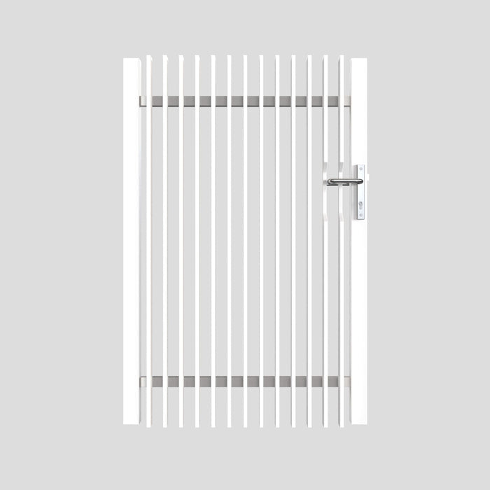 A modern architectural gate with vertical side-welded slats to match our aluminium blade fence panels. This gate can be supplied with a mortice lock system or without hardware. Selecting no hardware allows for a locking latch or other suitable hardware to be purchased separately.