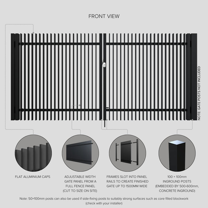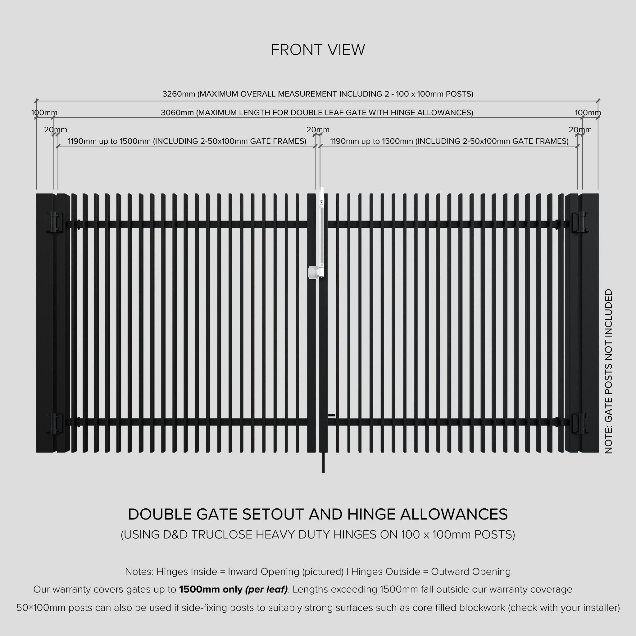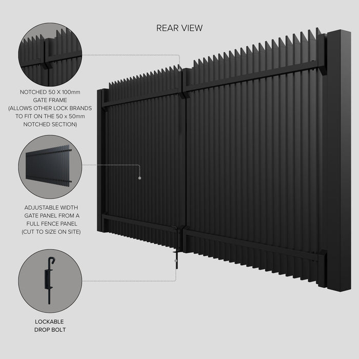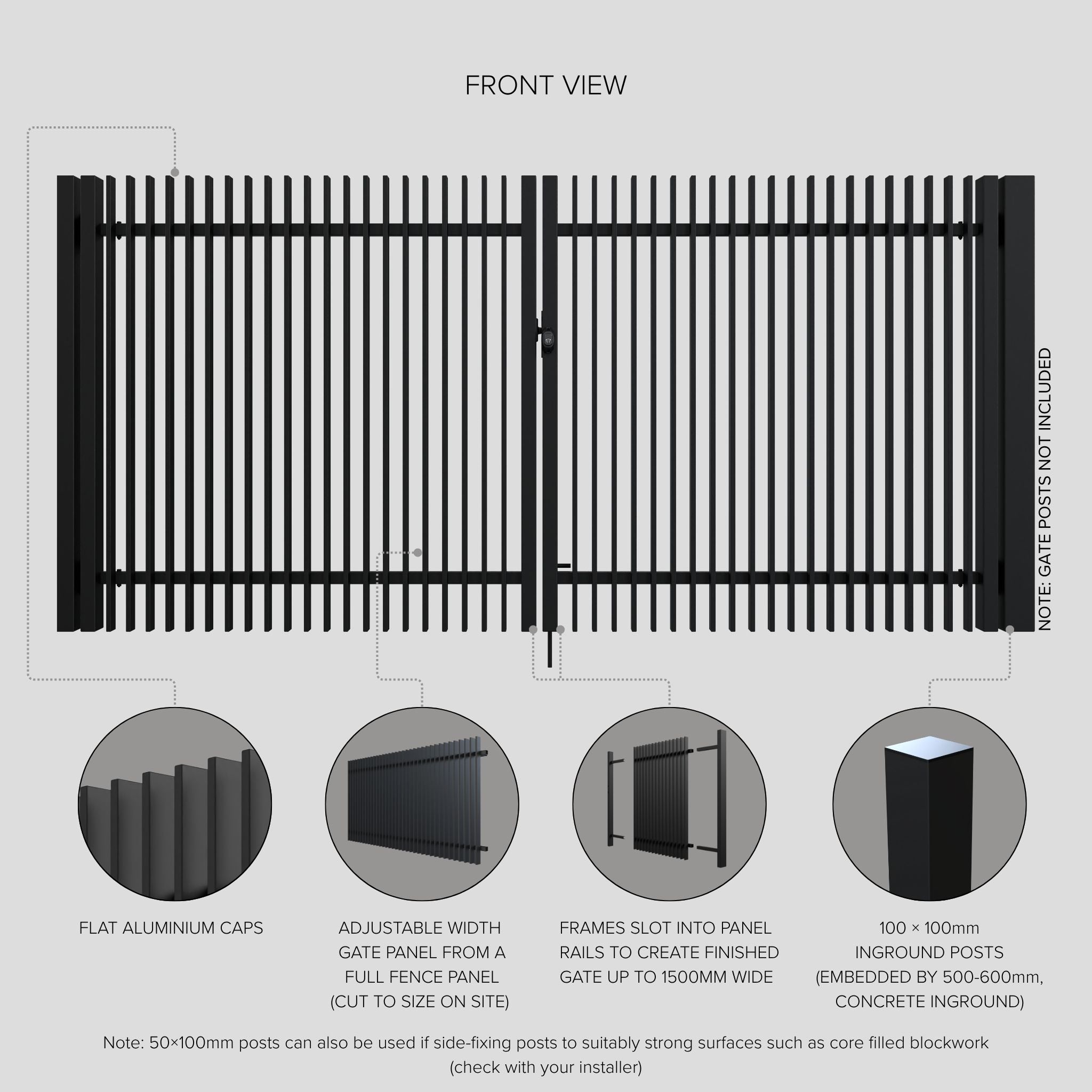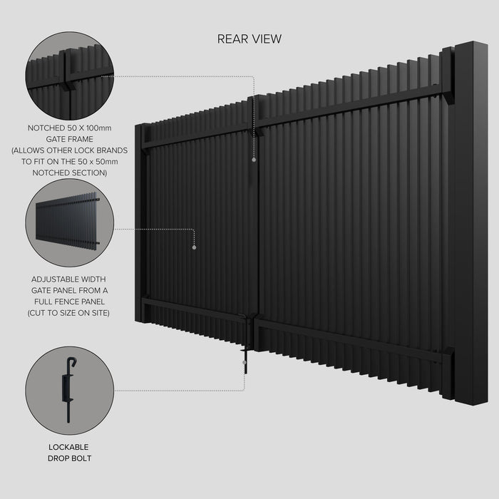 Build your own Double Gate with adjustable widths up to 1189mm or 1500mm per gate leaf and four height options. Gates do not come pre-assembled - trim the panel to size on site before assembling into the 50 x 100 gate frames. Posts sold separately - pair with 50 x 100 or 100 x 100 posts.