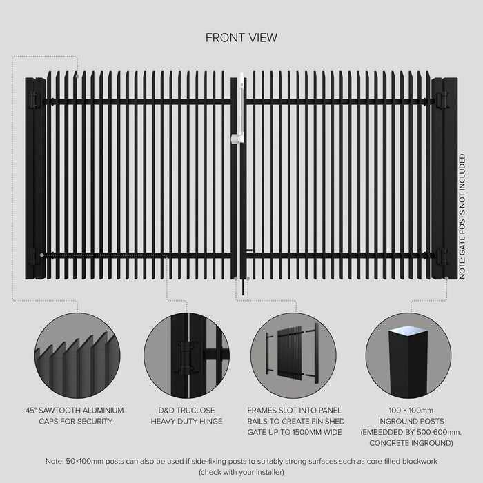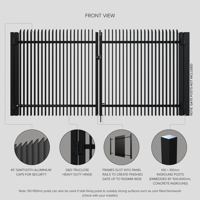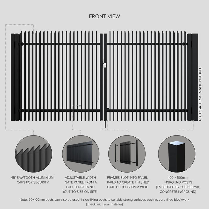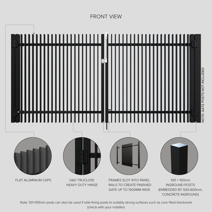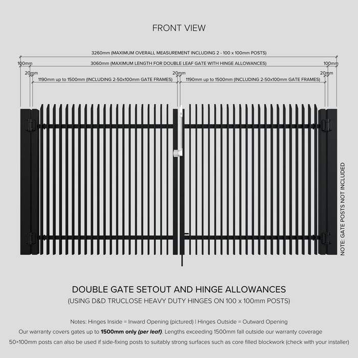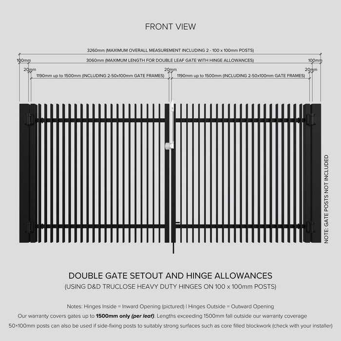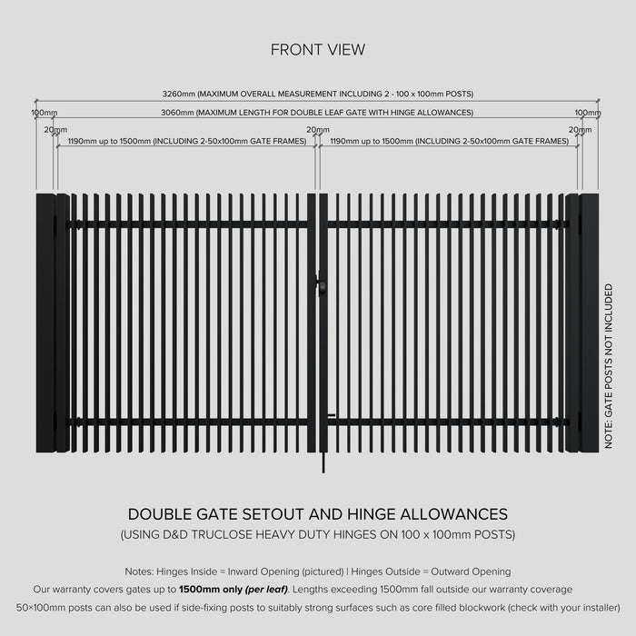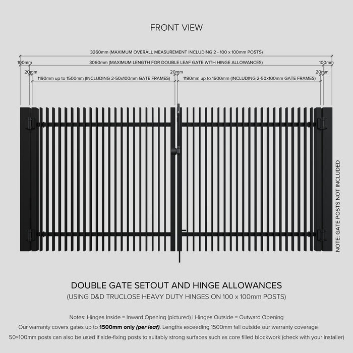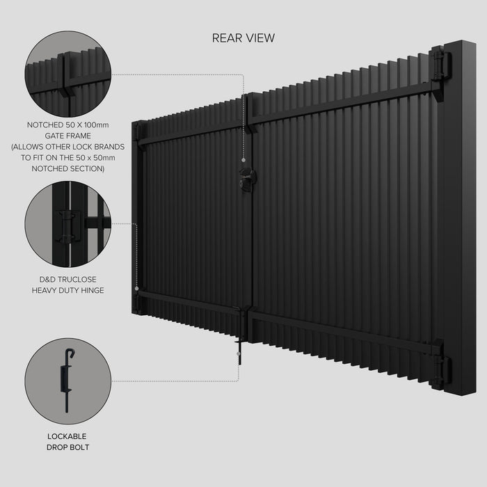 Build your own Double Gate with adjustable widths up to 1189mm or 1500mm per gate leaf and four height options. Gates do not come pre-assembled - trim the panel to size on site before assembling into the 50 x 100 gate frames. Posts sold separately - pair with 50 x 100 or 100 x 100 posts.