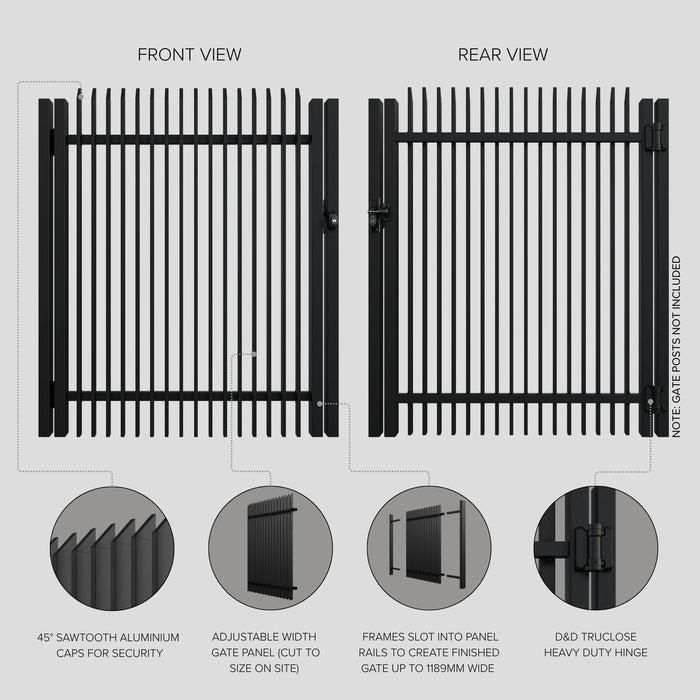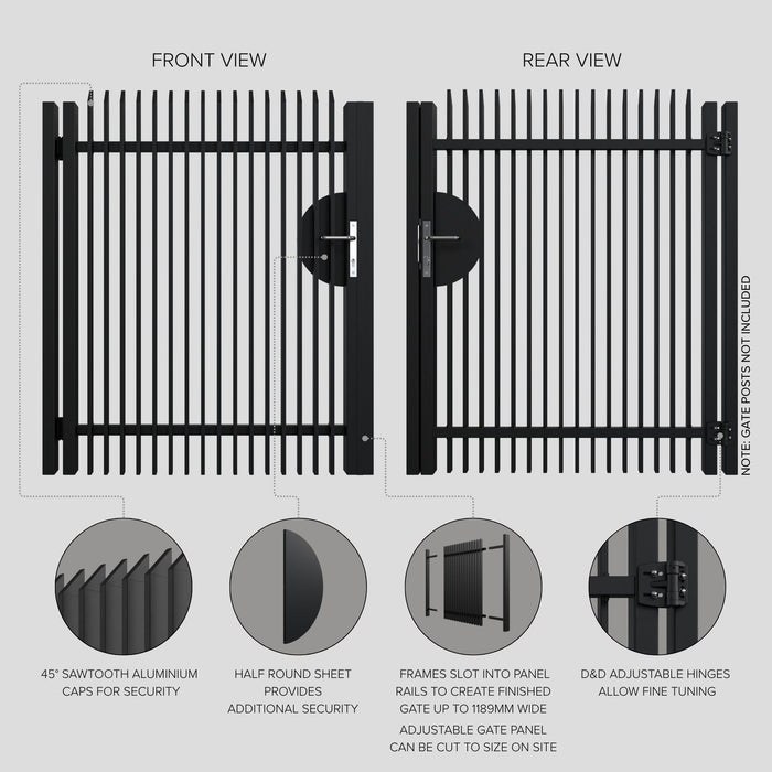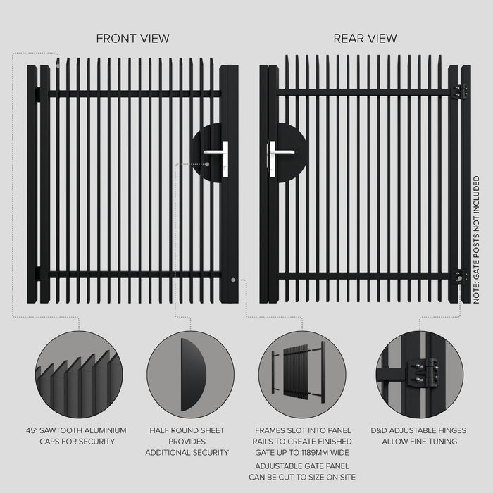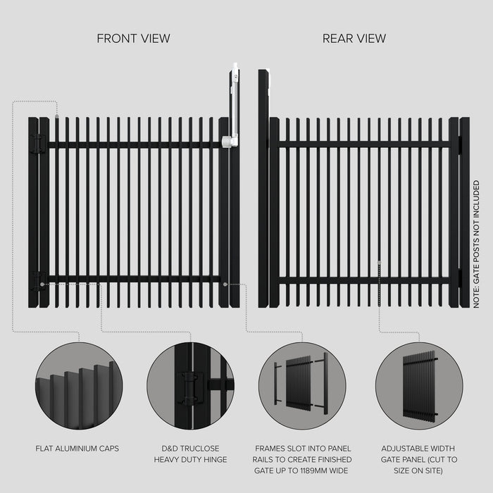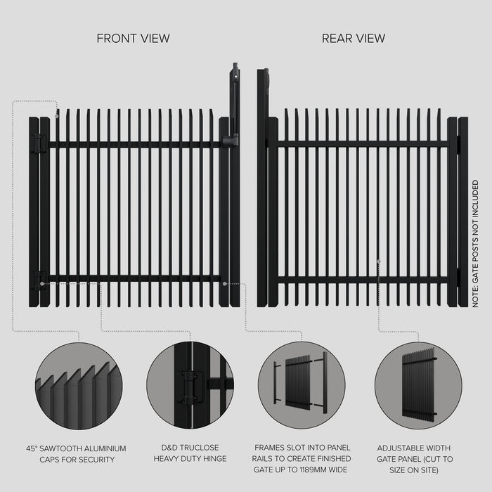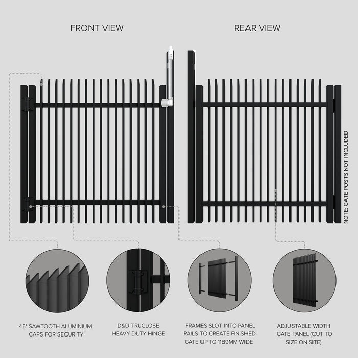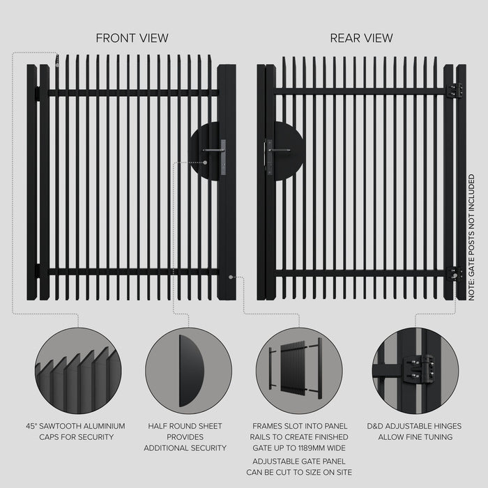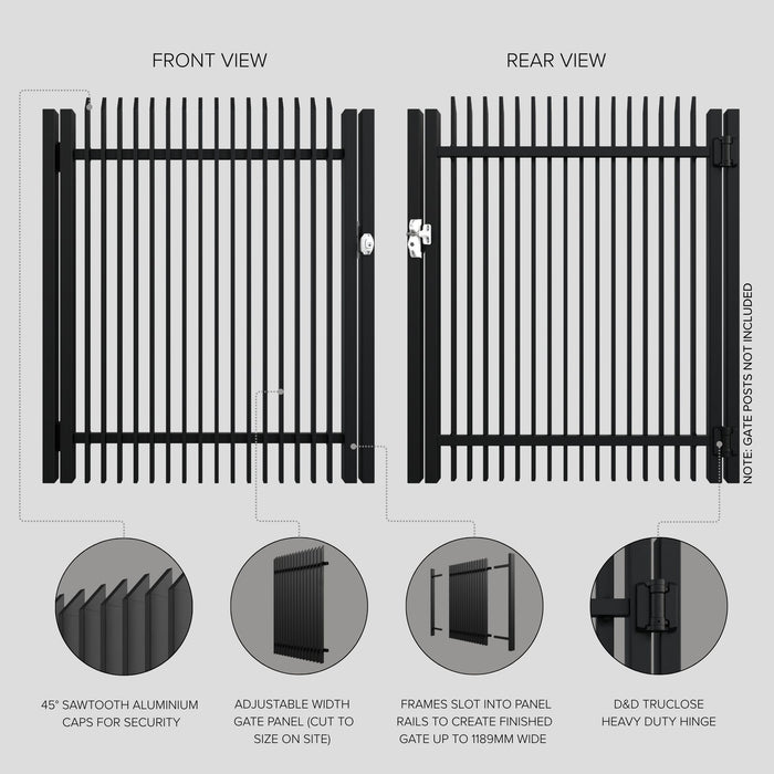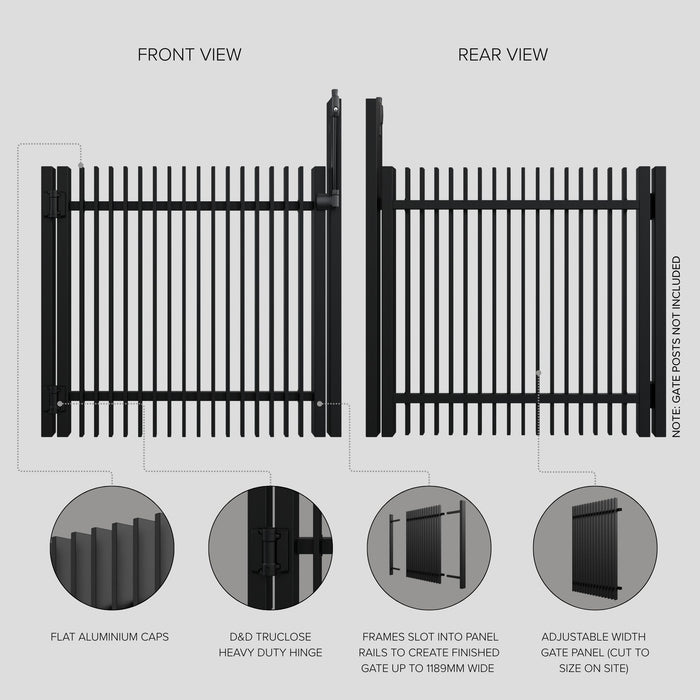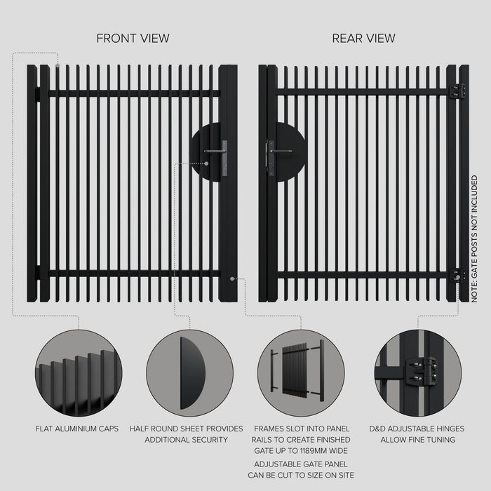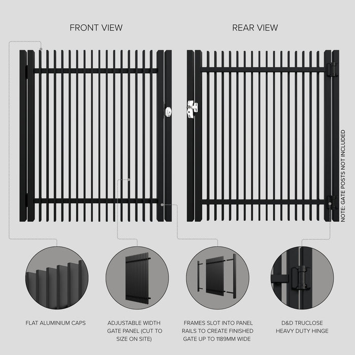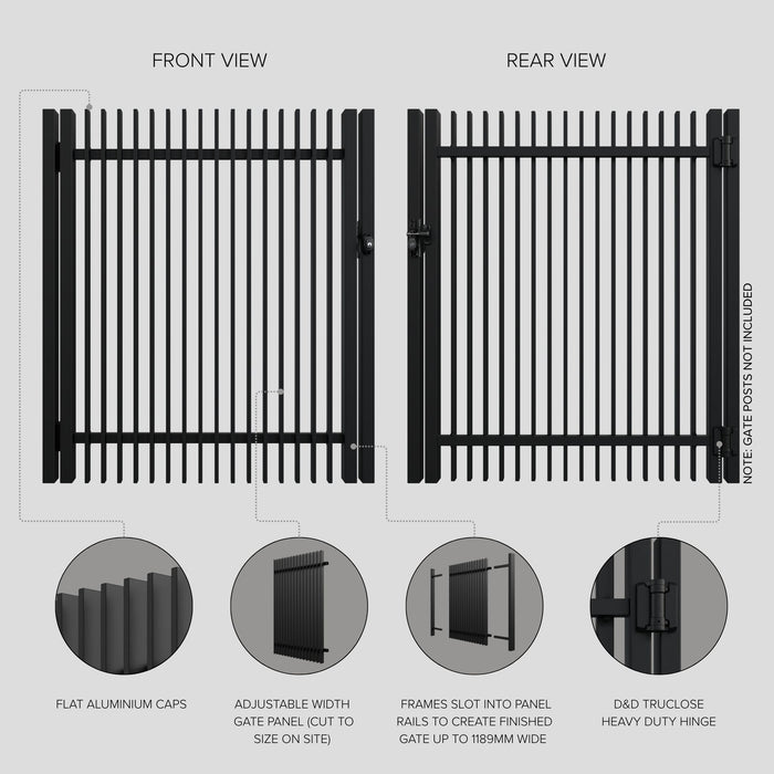 Build your own Blade Gate with adjustable widths up to 1189mm or 1500mm and four height options. Trim the panel to size on site before assembly. Posts sold separately. Some hardware not available for 1500mm wide gates.