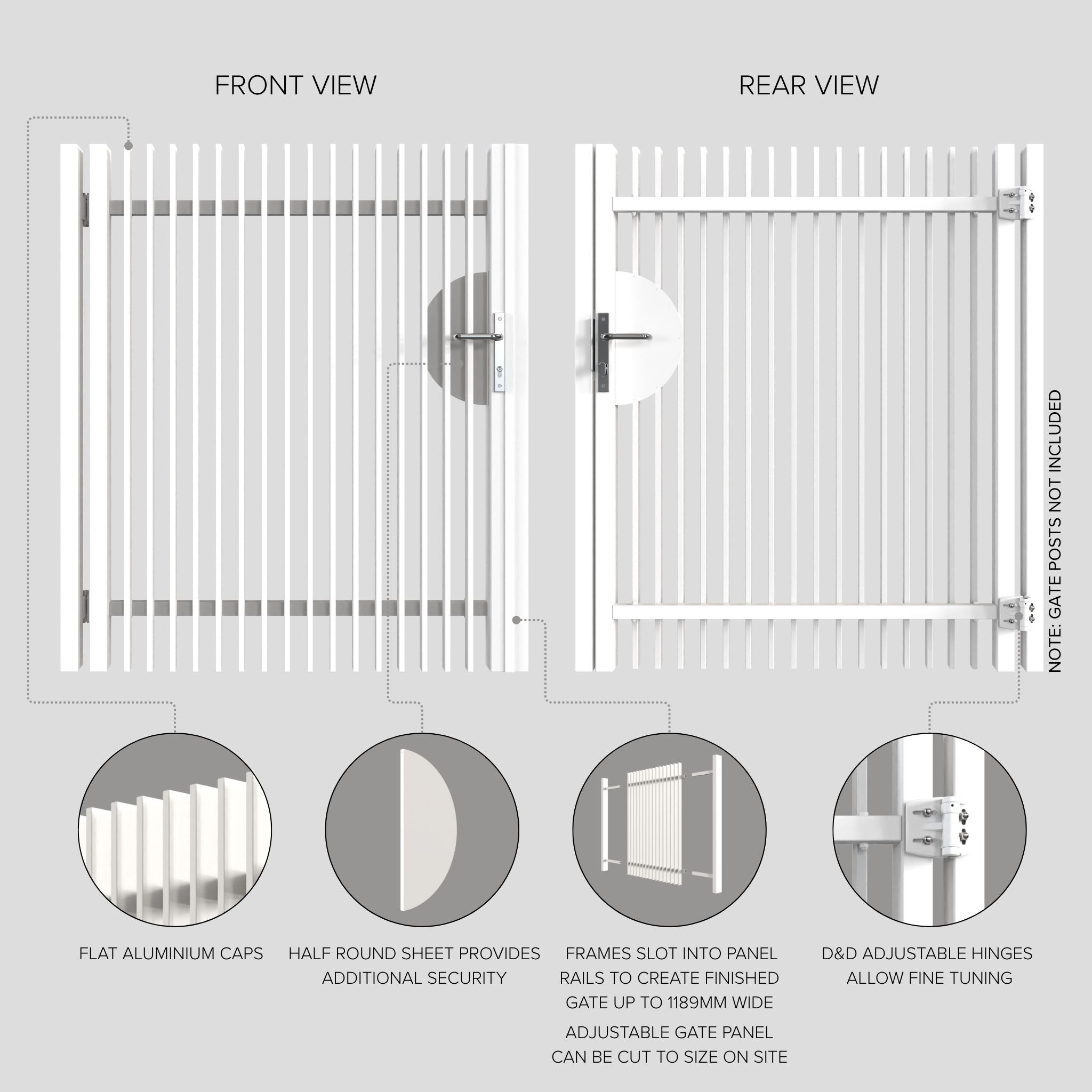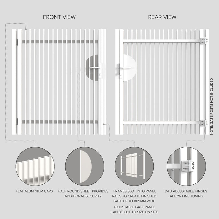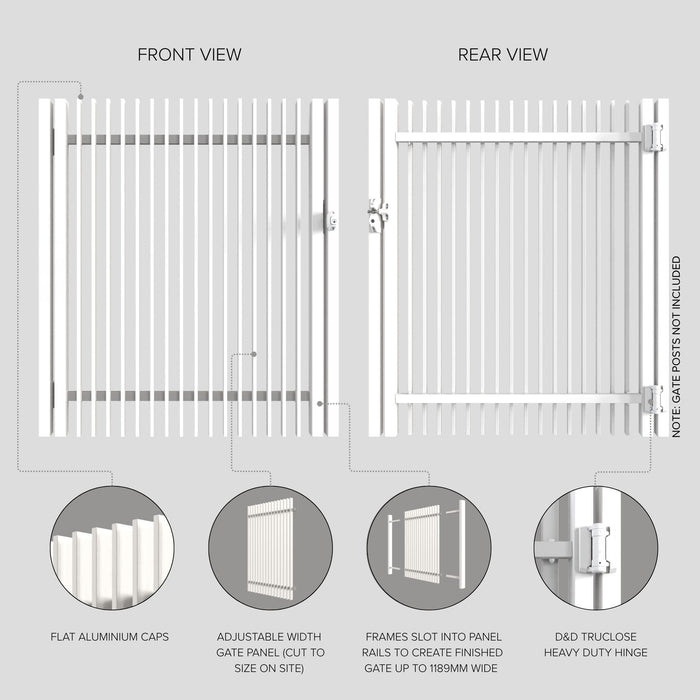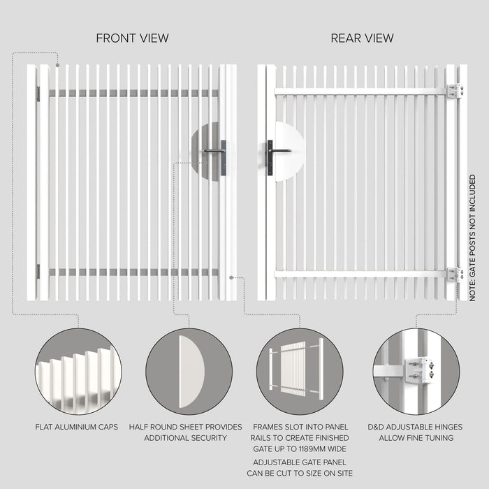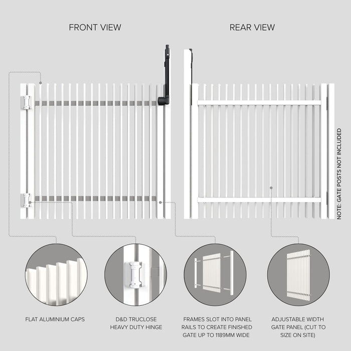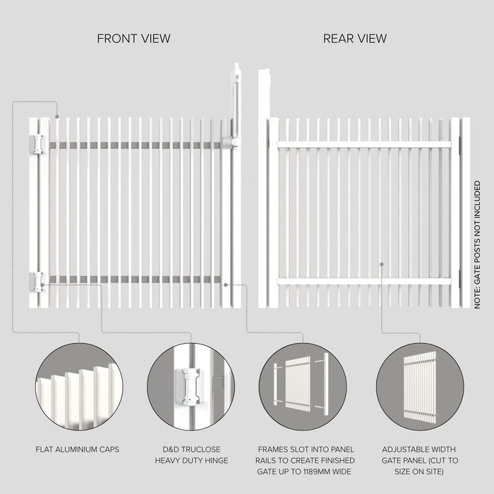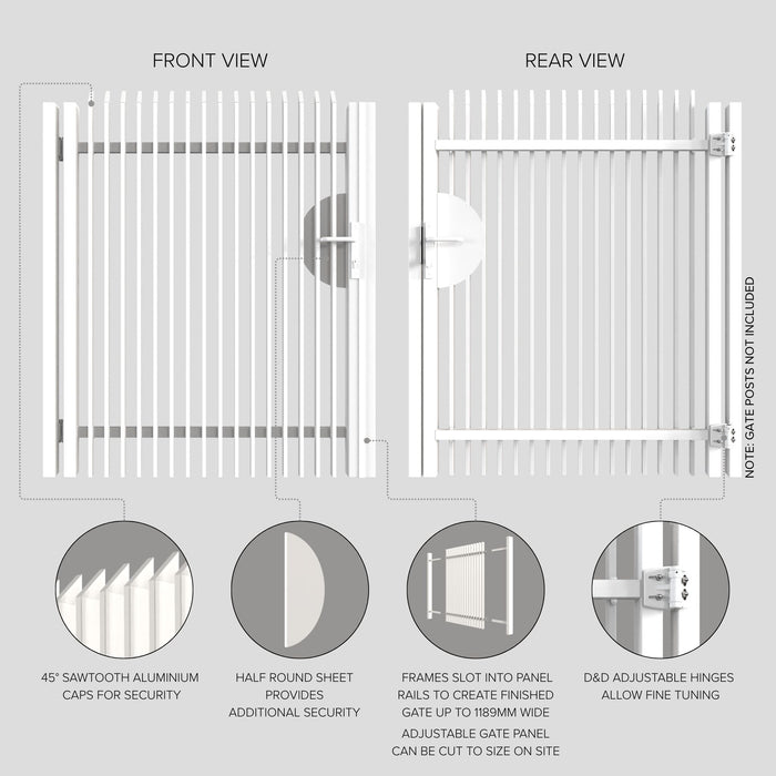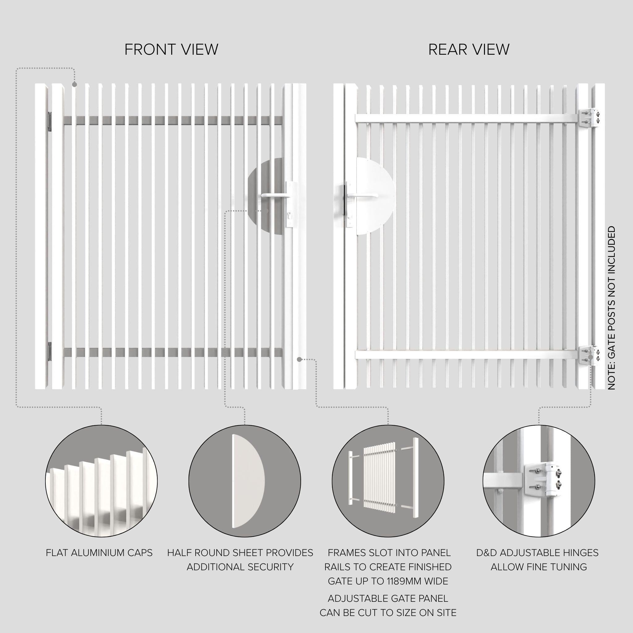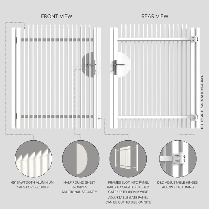 Build your own Blade Gate with adjustable widths up to 1189mm or 1500mm and four height options. Trim the panel to size on site before assembling into the 50 x 100 Gate Frames. Posts sold separately - pair with 50 x 100 or 100 x 100 posts.