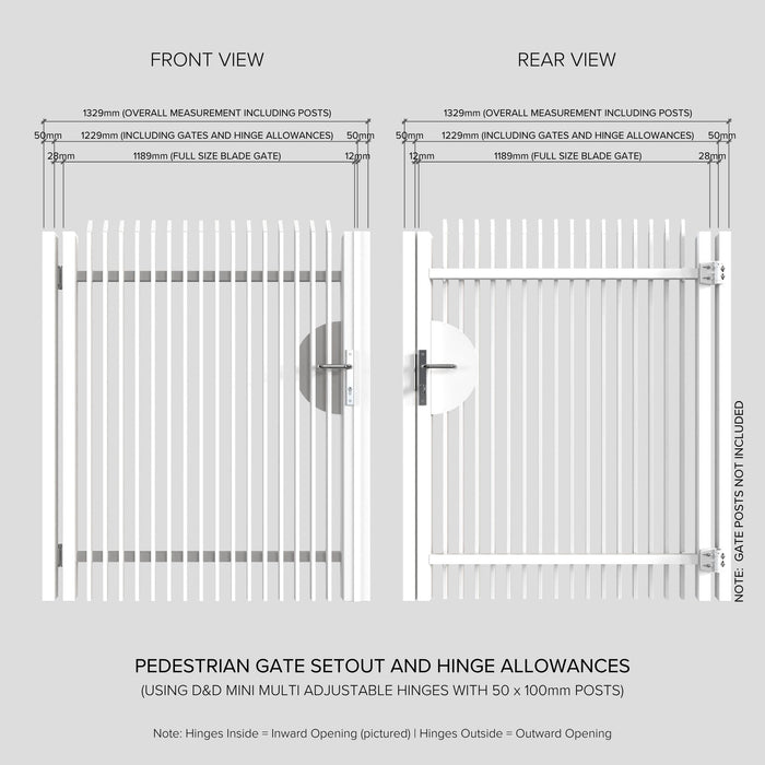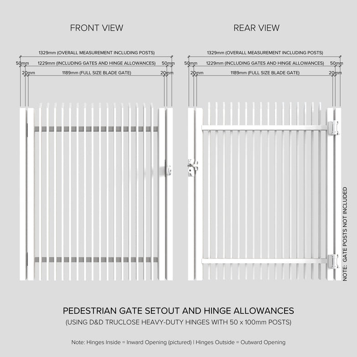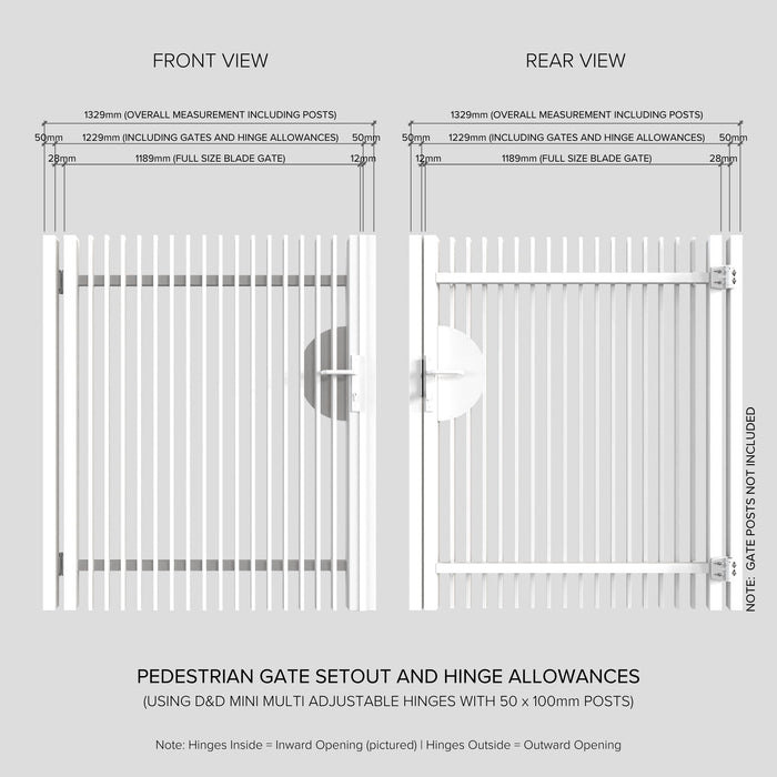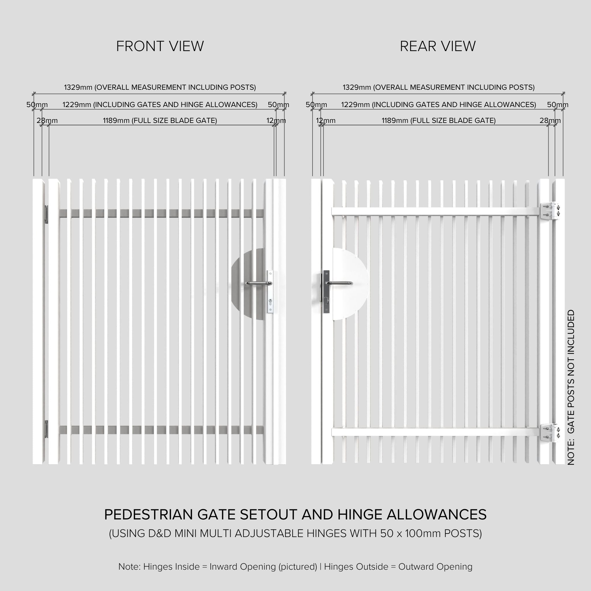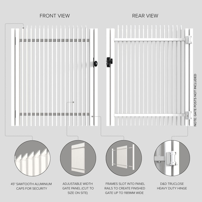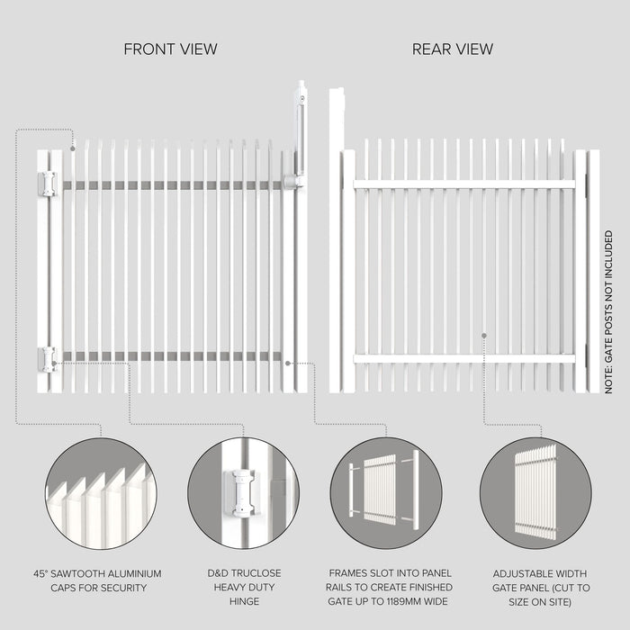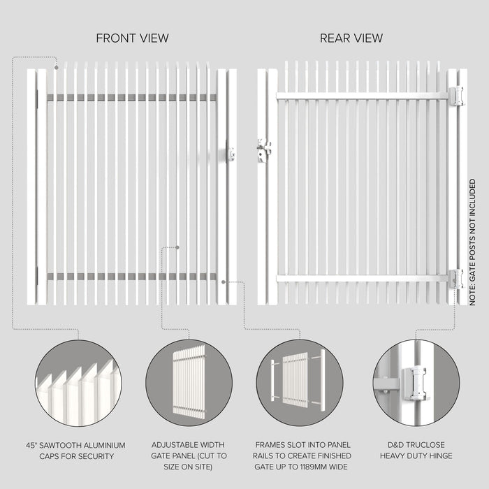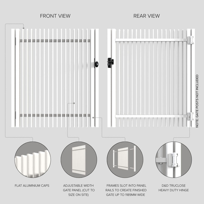Build your own Blade Gate with adjustable widths up to 1189mm or 1500mm and four height options. Trim the panel to size on site before assembling into the 50 x 100 Gate Frames. Posts sold separately - pair with 50 x 100 or 100 x 100 posts.