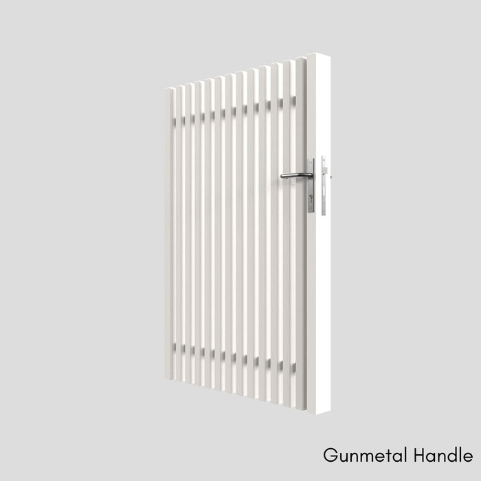 A modern architectural gate with vertical 40 x 40mm battens to match our aluminium batten fence panels. This gate is compatible with a lockable latch system.